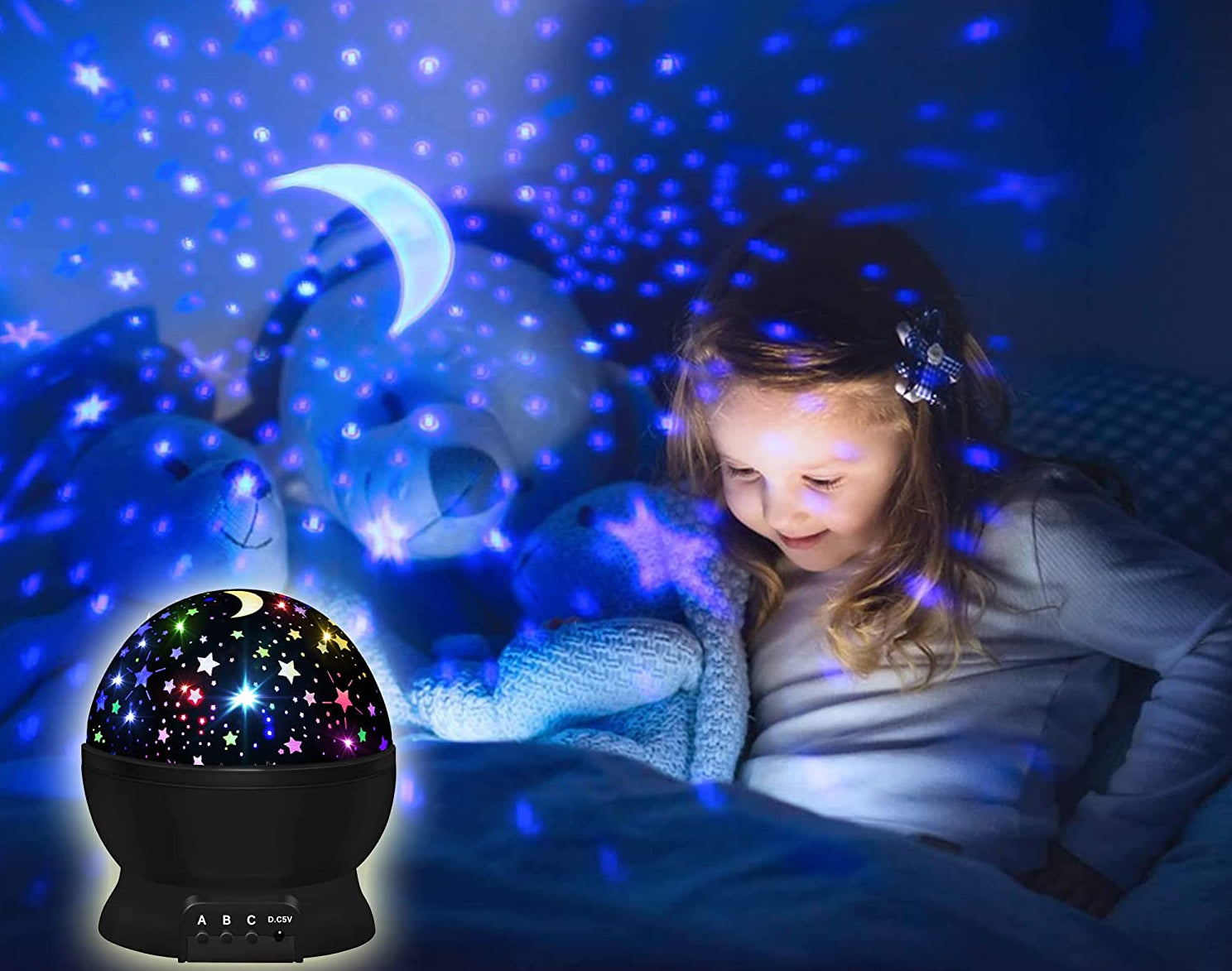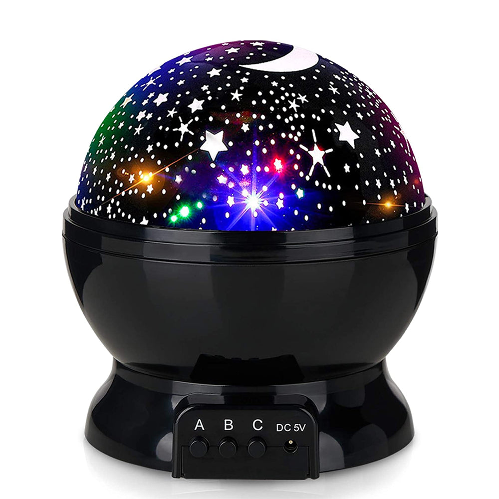 Dieser vielseitige LED Sternenhimmel Projektor als Nachtlicht bietet eine fesselnde Lichtshow mit mehreren Farboptionen, um jede Stimmung zu treffen. Mit den einfachen Bedienelementen (Tasten A, B, C) können Sie mühelos zwischen leuchtendem Rot, beruhigendem Blau, friedlichem Grün oder einer magischen Mischung aus verschiedenen Farben wechseln. Beobachten Sie, wie die Sterne und der Mond sanft über die Decke und Wände rotieren und so ein dynamisches und immersives Erlebnis schaffen. Das sanfte Leuchten ist ideal als Nachtlicht, da es genügend Helligkeit spendet, ohne zu grell zu sein, und so einen ungestörten Schlaf gewährleistet. Betrieben wird der Projektor über D.C 5V, was ihn besonders praktisch und flexibel in der Anwendung macht.